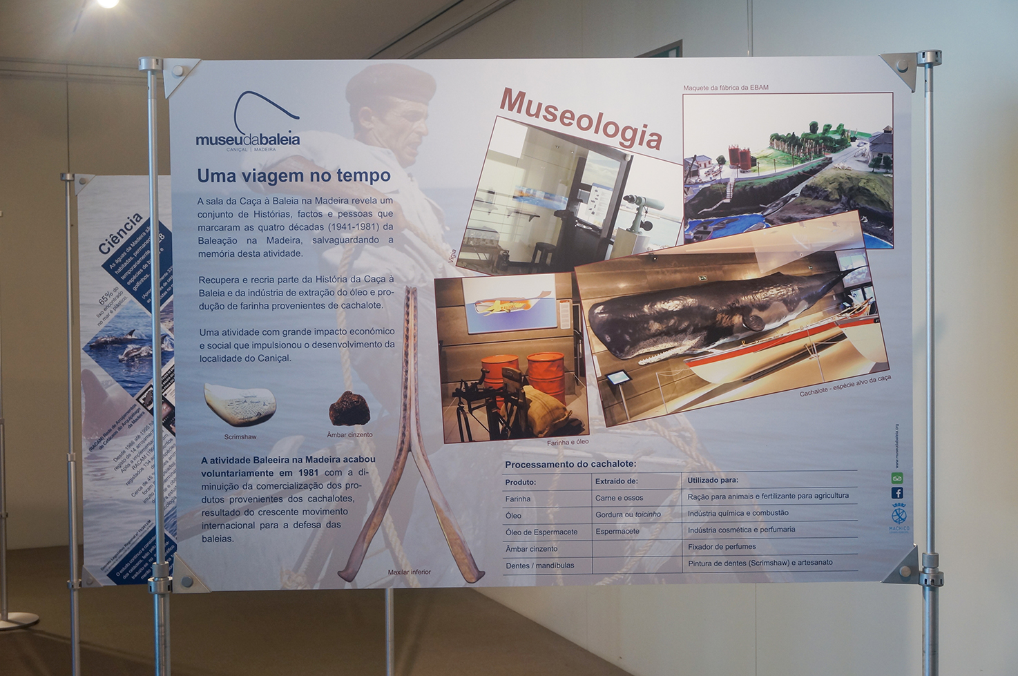 The itinerant exhibition "Um museu: histórias de vida e de mar" was inaugurated in 16 November of 2016, related with the celebration of the National Sea Day. Its aim is to raise awareness of the Madeira Whale Museum and its mission. It deals with aspects of the history of the museum, its units - Museology, Science and Education. It also presents part of the work made in the institution, through 7 Panels, in English and Portuguese language version.