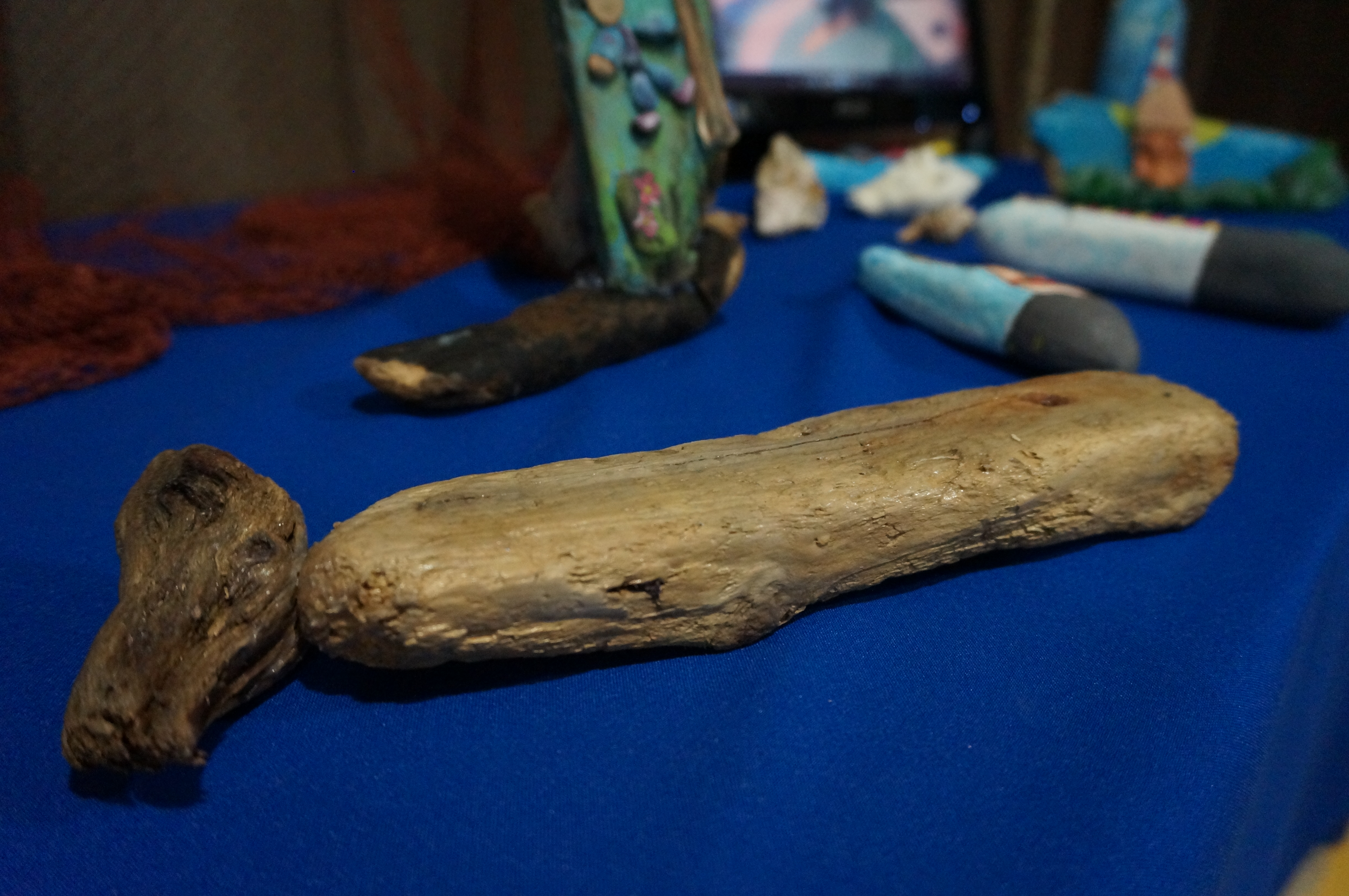 Photographs of sperm whales sighted in Madeira and artworks from craftsman João Sousa.BaleiArte